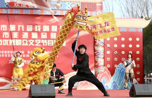 黄河飞龙、龙凤灯舞、常家武虎、文武高跷……2月12日,元宵节,在美丽的龙源湖畔,“放歌怀川 出彩焦作——文化进万家”焦作市非遗精品项目展演如约而至,焦作非遗“全明星阵容”不负期待,为观众奉献了一场气势非凡、欢乐祥和的“非遗大餐”。图为节目《飞龙武狮黄河魂》。