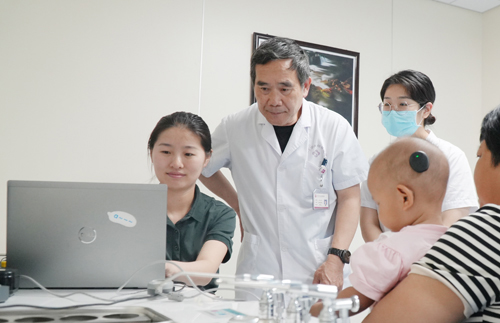 市妇幼保健院耳鼻喉咽科学术带头人钟彦(左二)和技术人员为一岁宝宝进行耳蜗电极测试。
