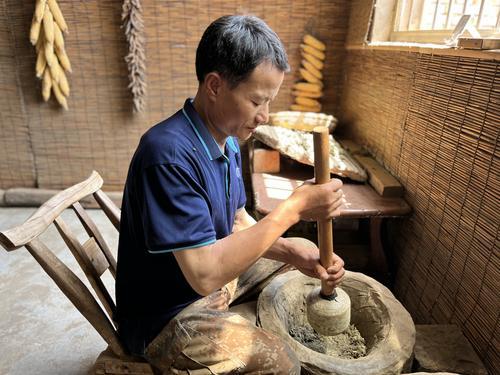 用石碾将艾叶反复碾制。