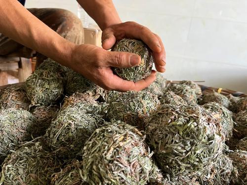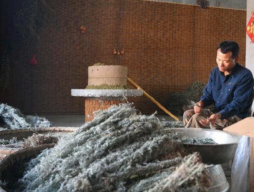 摘取晒干的艾叶。