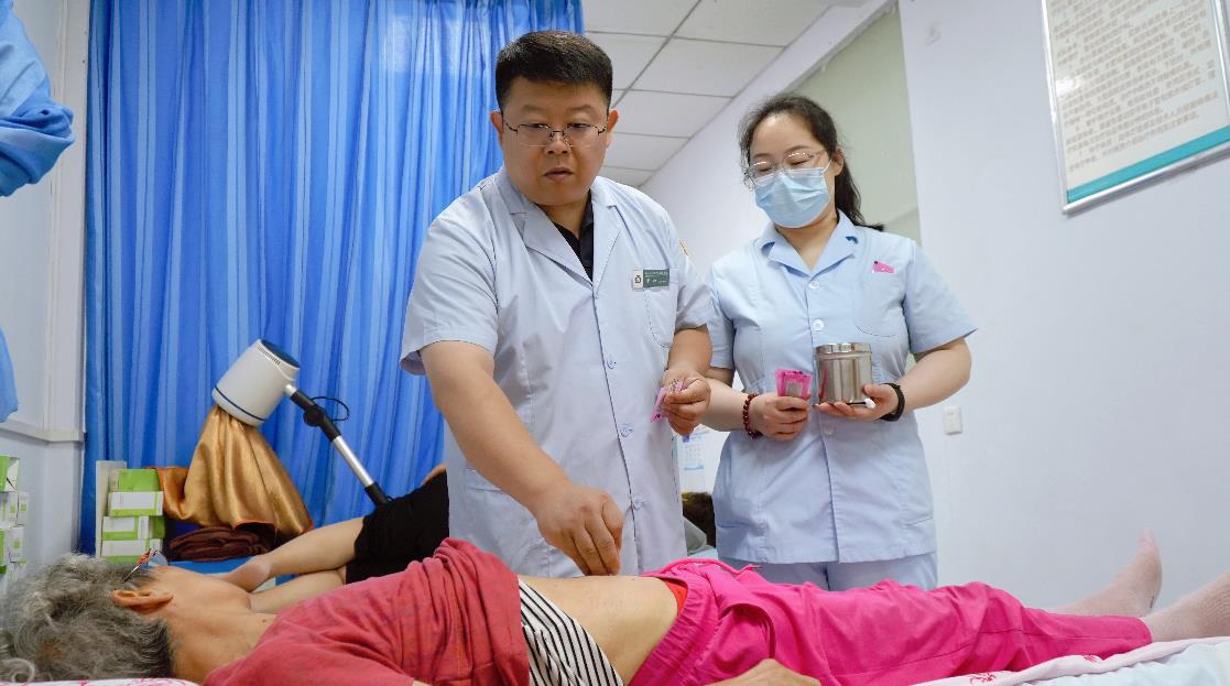焦作市民间名中医、解放区新华西社区卫生服务中心中医科主任常虹为患者做中医针灸治疗。