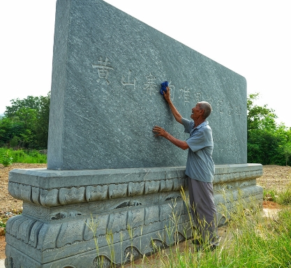 黄山寨惨案亲历者赵明善老人在擦拭纪念碑,缅怀殉难同胞。 杨红涛 摄