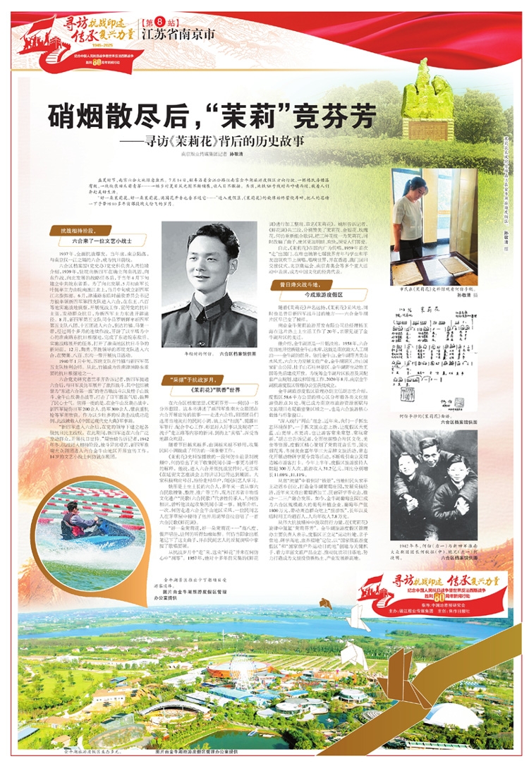 在六合区档案馆里,《茉莉芬芳——何仿》一书分外惹眼。这本书讲述了新四军淮南大众剧团在六合开展宣传的故事——走进六合后,剧团团员们选用当地流行的民间小调,填上反“扫荡”、揭露日军罪行、配合中心工作、彰显好人好事以及规劝“二流子”走正路等内容的新词,到街上“卖唱”,深受当地群众欢迎。