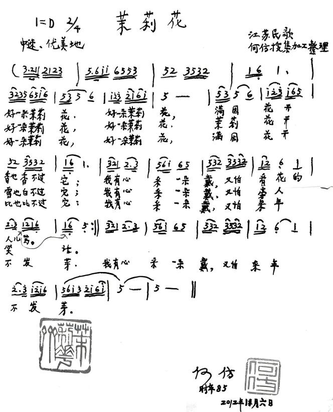 从抗战岁月中“走”来,这朵“鲜花”并未在何仿心中“凋零”。1957年,他对十多年前采集的《鲜花调》进行加工整理,取名《茉莉花》。姚彤告诉记者,《鲜花调》共三段,分别赞美了茉莉花、金银花、玫瑰花,何仿重新组合歌词,把三种花统一为茉莉花,同时改编了曲子,使其更加明朗、欢快,深受人们喜爱。