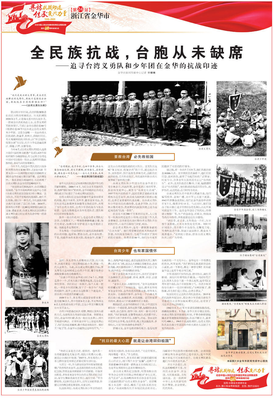今年7月,为纪念中国人民抗日战争胜利暨台湾光复80周年,《金瓯无缺华夏永固——台湾同胞反殖民反侵略图文展》在金华市城市展示馆开展。这次展览中,一张张老照片跨越时空,生动再现了台湾义勇队在金华的那段峥嵘岁月。