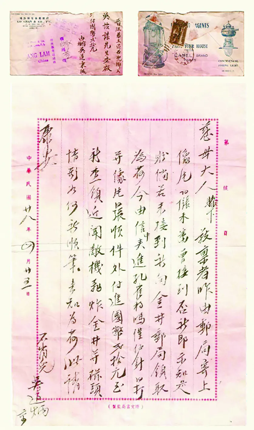 信笺是1931年九一八事变之后由菲律宾华侨李兆樑的公司印制的。侵占东北三省后,残暴的日军对我3000多万东北同胞烧杀抢掠,犯下了惨无人道的罪行。在奉天(今沈阳)小西门通行的国人必须经过日寇的无理检查。海外华人华侨闻讯后义愤填膺,纷纷向国内捐钱捐物,表达誓与日寇抗争到底的决心。这封批信的信笺正是抗日烽火的浓缩表现,它强调中国人民必须奋起抗争,保卫家园;必须团结一心,通过自身发展,抵御外敌。