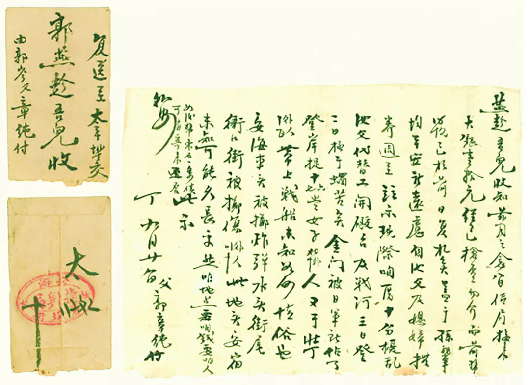 1937年7月7日卢沟桥事变之后,中国全民族抗战打响。当年10月,丧心病狂的日本侵略军悍然对闽南沿海地区施行轰炸、掠夺、奸淫、烧杀等野蛮行径。1937年10月,晋江东石郭岺乡的郭章纯寄给马来亚太平埠的儿子郭燕趁的回批,记载了日军在晋江、南安、金门等地进行轰炸并掳掠女子及壮丁的史实。回批中写道:“现际咱厝十分扰乱,汝父代替工开炮台及战河[壕],三日登[顶]二日,极于蜗苦矣。金门被日军所占了,登岸捉十六七岁女子40外[多]人,又于[抓]壮丁100外[多]人,带上战船,未知如何情俗也。安海车头[站]被掷炸弹,水头街尾、衙口街被掷伤30外[多]人,此地头安宿未知可能久长乎……”(注:该侨批多用闽南方言叙事,“[ ]”内为其所表达之意。)