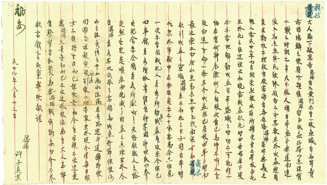 1947年8月,侨居在马来亚的许子英寄给闽南翁姑(即公、婆)的家书,记载了她与丈夫黄成益“义胆忠孝”的壮丽篇章。