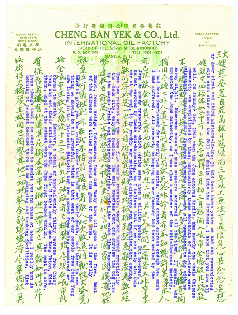 侨批中写道:“战争燃遍菲岛,鱼雁杳杳。遥想起居佳胜,欣慰奚如。惟母亲近来康健否,二姊处现况如何,祈为示知。惟弟此次被敌惨害,刺刀穿心背出,幸吉人天相,重再复生,藉以告慰……”