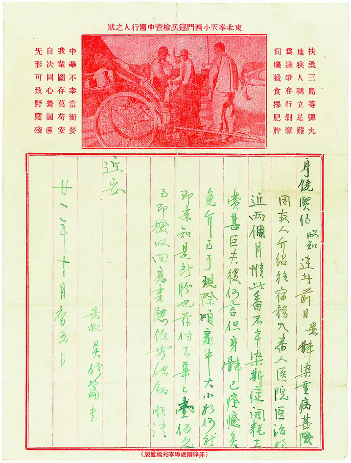 在一封1932年10月5日菲律宾吴修篇寄给晋江吴身铙批信的信笺上,印有“东北奉天小西门寇兵检查中国行人之状”图案和油诗文字:“扶桑三岛等弹丸,地狭人稠立足难,为达争存行剥夺,伺机猎食择肥胖”“中华不幸当卫要,我辈图存莫苟安,自决同心营国产,无形可致野鹰残”。在当时特定时代背景下,该笺的使用和流通,发挥了警示、宣传抗日的积极作用。