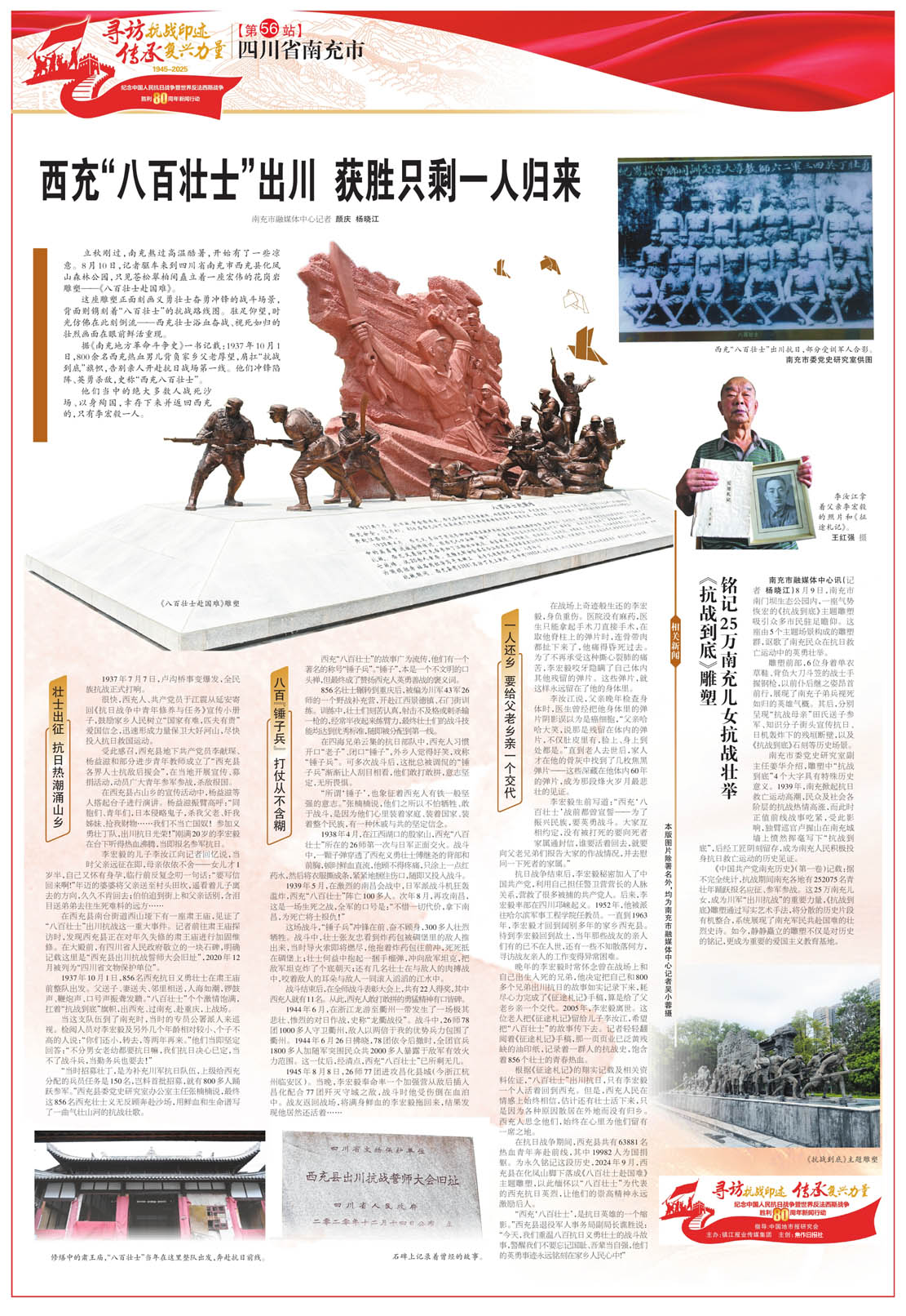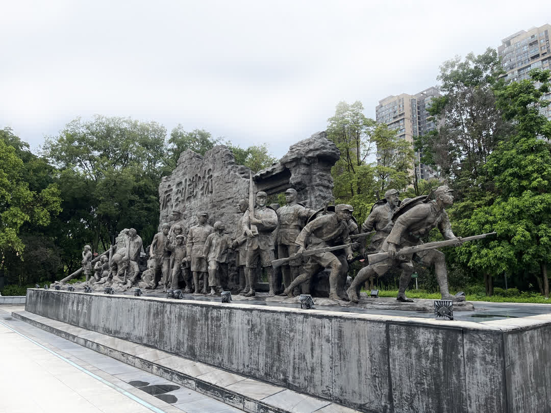 这座雕塑正面刻画义勇壮士奋勇冲锋的战斗场景,背面则镌刻着“八百壮士”的抗战路线图。驻足仰望,时光仿佛在此刻倒流——西充壮士浴血奋战、视死如归的壮烈画面在眼前鲜活重现。