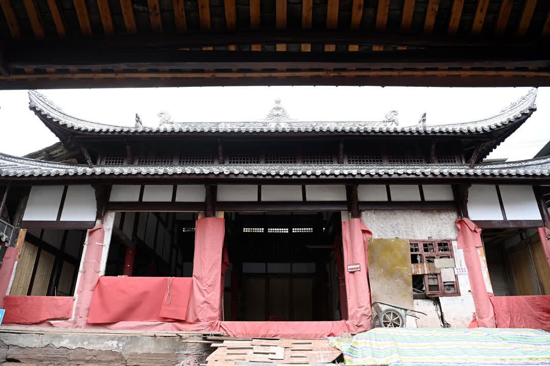 修缮中的肃王庙,“八百壮士”当年在这里整队出发,奔赴抗日前线。