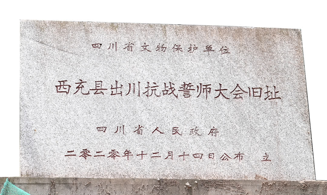 在西充县南台街道西山垭下有一座肃王庙,见证了“八百壮士”出川抗战这一重大事件。记者前往肃王庙探访时,发现西充县正在对年久失修的肃王庙进行加固维修。在大殿前,有四川省人民政府敬立的一块石碑,明确记载这里是“西充县出川抗战誓师大会旧址”,2020年12月被列为“四川省文物保护单位”。