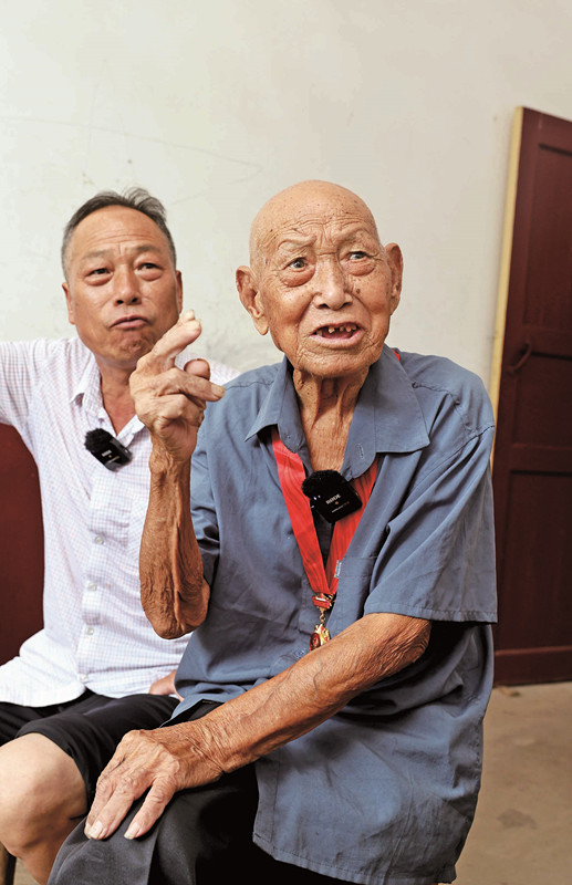 梁为仁老人(右)和小儿子梁建辉(左)在讲述抗战故事。(湘潭日报社全媒体记者 李新辉 摄)
