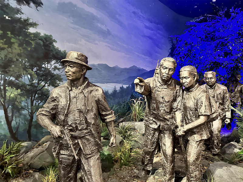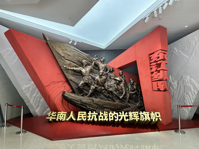 步入东江纵队纪念馆,首先映入眼帘的是《华南人民抗战的光辉旗帜》主题雕塑。雕塑以生动的姿态,展现东江纵队战士们英勇无畏、奋勇抗敌的场景;红色的“东江纵队”4个大字,不仅彰显着这支英雄队伍的赫赫威名,更展现了华南人民抗战的热血与力量。
