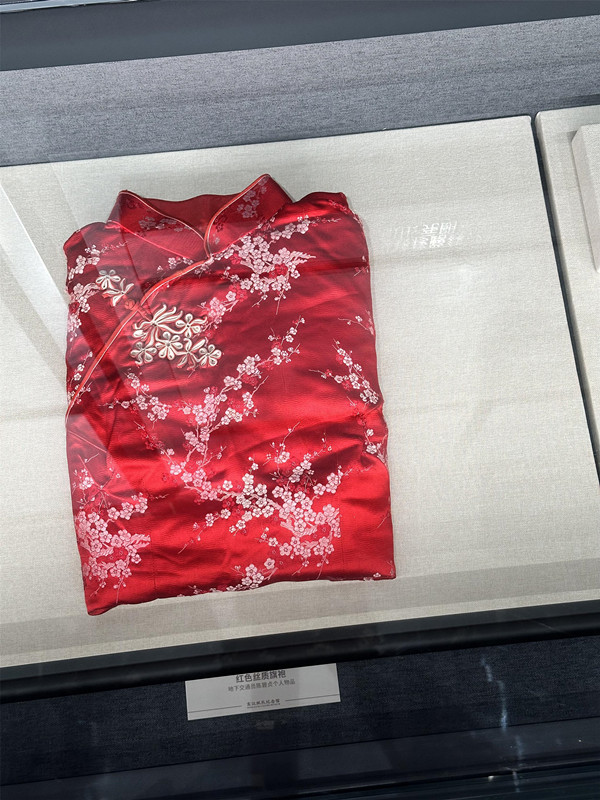 在馆内的展柜中,一袭红色丝质旗袍静静陈列。灯光透过玻璃洒在缎面上,炽烈的红如同跳动的火焰,旗袍上朵朵梅花刺绣傲然绽放,辉映着东纵战士坚定的革命信仰。在那个战火纷飞的年代里,这不是普通的服饰,而是穿在战士身上的“情报战袍”。