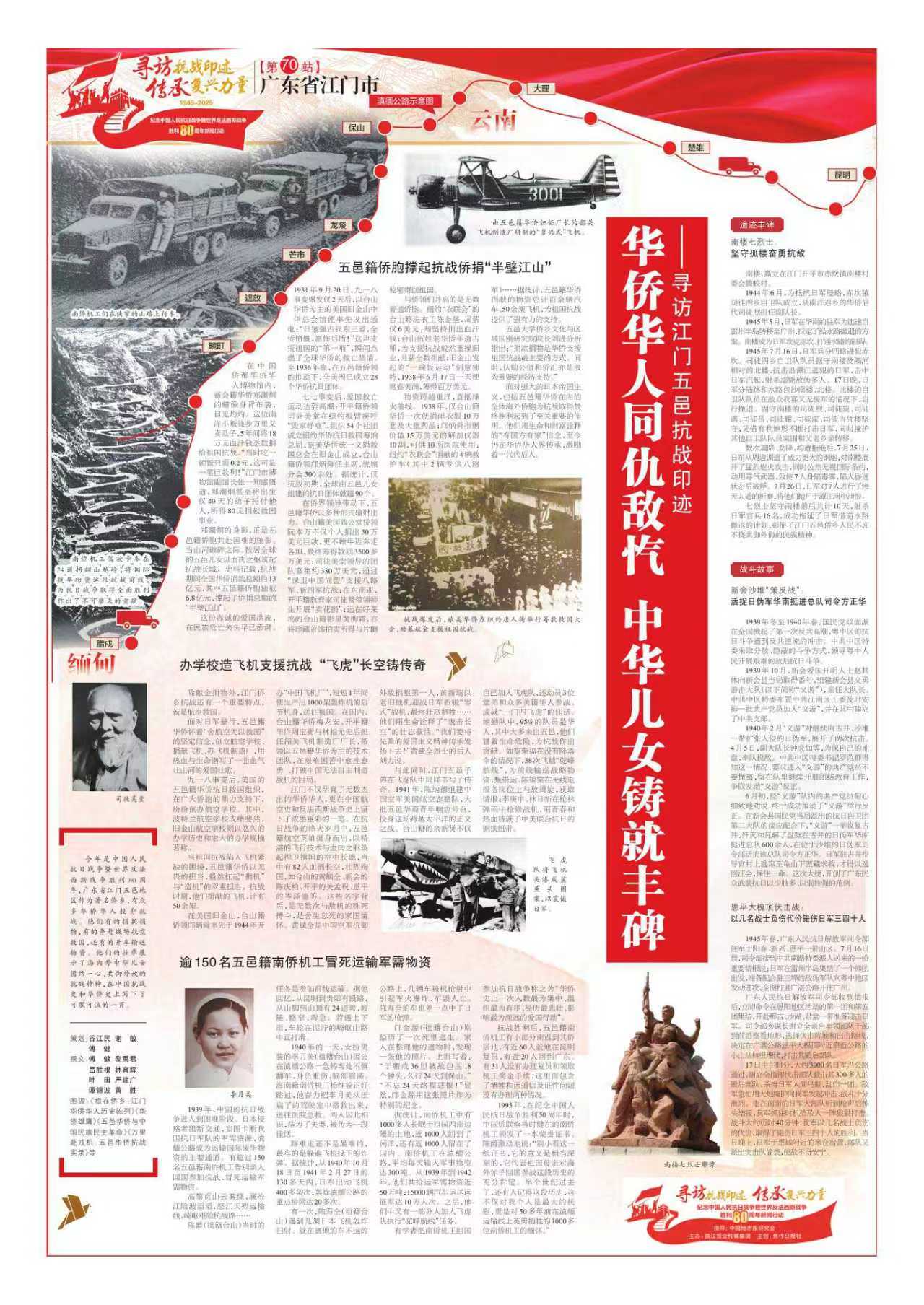 今年是中国人民抗日战争暨世界反法西斯战争胜利80周年,广东省江门五邑地区作为著名侨乡,有众多华侨华人投身抗战。他们有的捐款捐物,有的奔赴战场航空救国,还有的开车输送物资。他们的壮举展示了海内外中华儿女团结一心、共御外敌的抗战精神,在中国抗战史和华侨史上写下了可歌可泣的一页。
