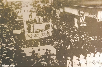抗战爆发后,旅美华侨在纽约唐人街举行筹款救国大会,劝募献金支援祖国抗战。