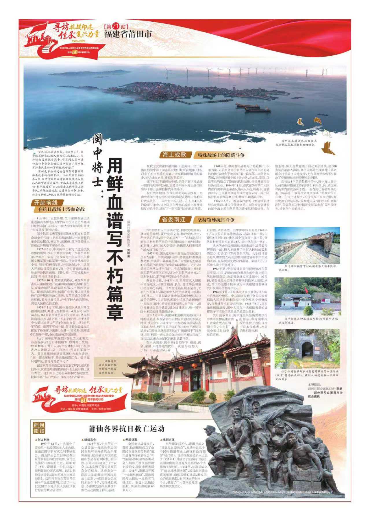 记者从莆田市委党史方志室了解到,在抗日战争中,仅莆仙两县牺牲的闽中北上抗日将士就有23位。他们用自己的生命换取民族的独立,把鲜血洒在抗日战场上,谱写出不朽的篇章。