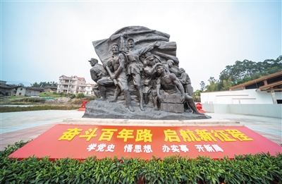 涵江区大洋乡闽浙赣人民游击纵队闽中支队司令部旧址石碑上的英雄群像。