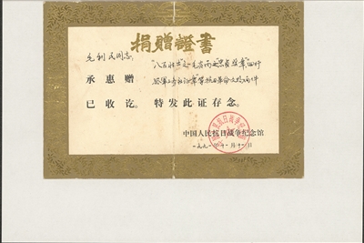 中国人民抗日战争纪念馆向“八百壮士”毛炎丙亲属颁发的捐赠证书