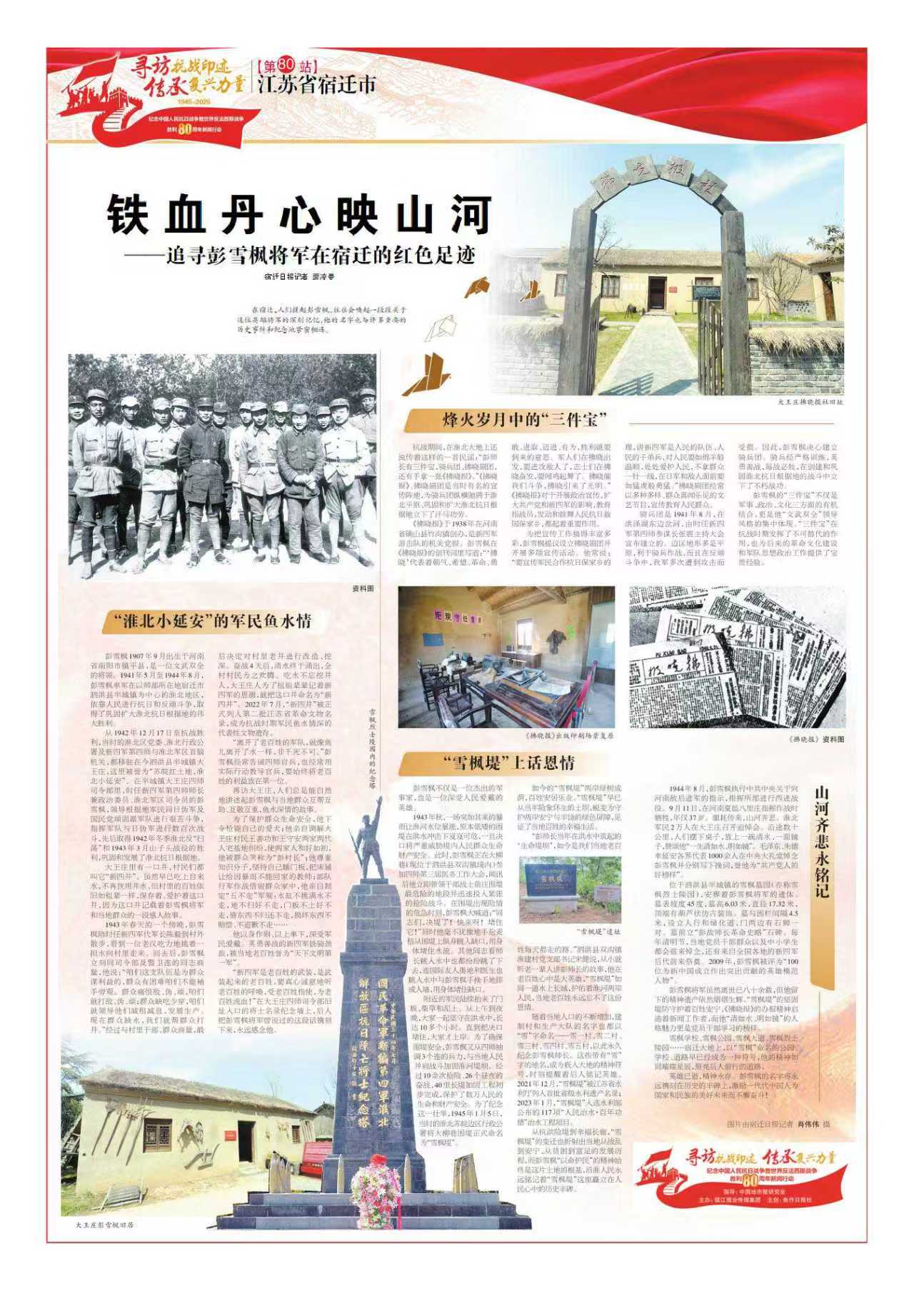 彭雪枫1907年9月出生于河南省南阳市镇平县,是一位文武双全的将领。1941年5月至1944年8月,彭雪枫率军在以师部所在地宿迁市泗洪县半城镇为中心的淮北地区,依靠人民进行抗日和反顽斗争,取得了巩固扩大淮北抗日根据地的伟大胜利。