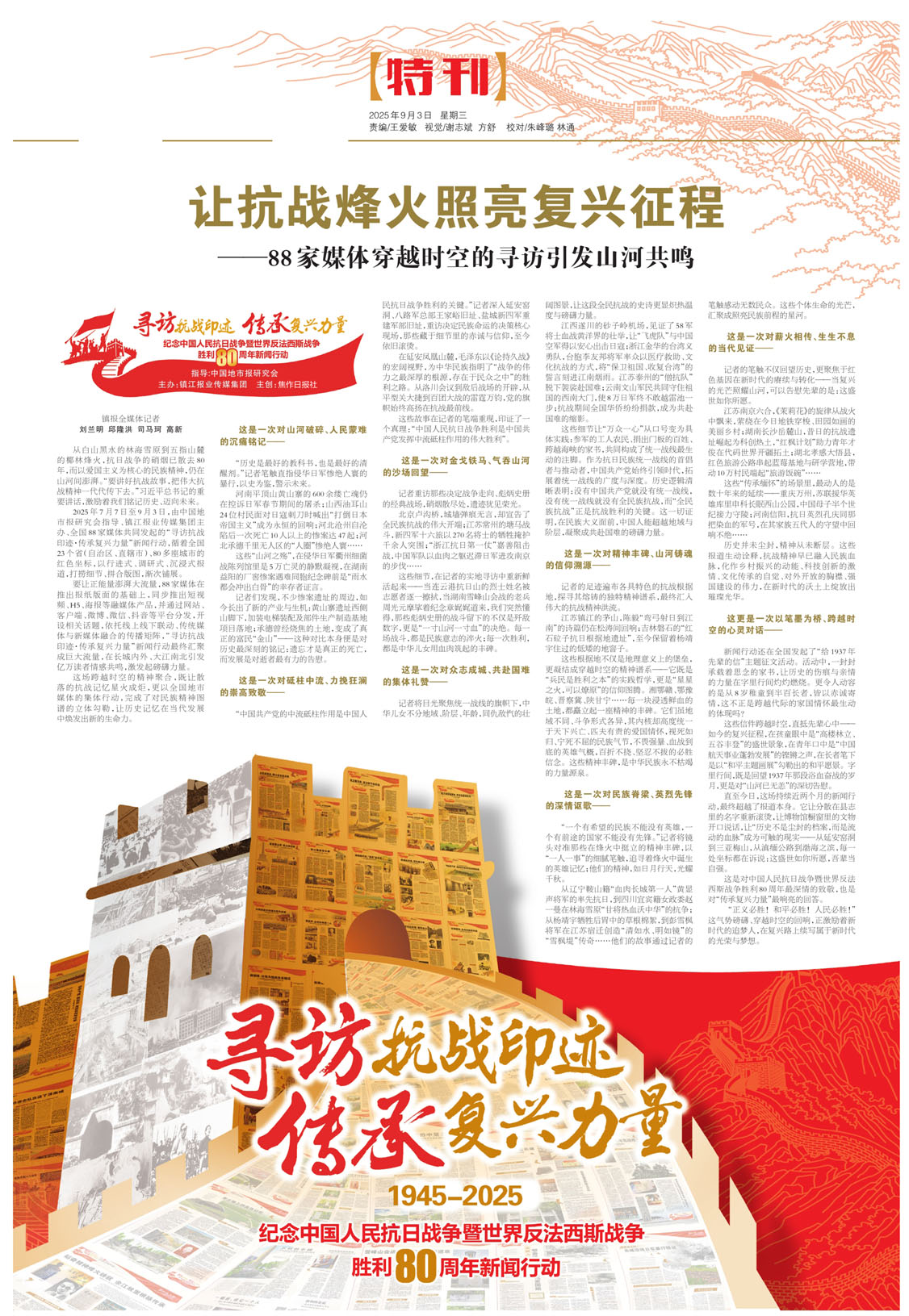 2025年7月7日至9月3日,由中国地市报研究会指导、镇江报业传媒集团主办、全国88家媒体共同发起的“寻访抗战印迹·传承复兴力量”新闻行动,循着全国23个省(自治区、直辖市)、80多座城市的红色坐标,以行进式、调研式、沉浸式报道,打捞细节、拼合版图,渐次铺展。