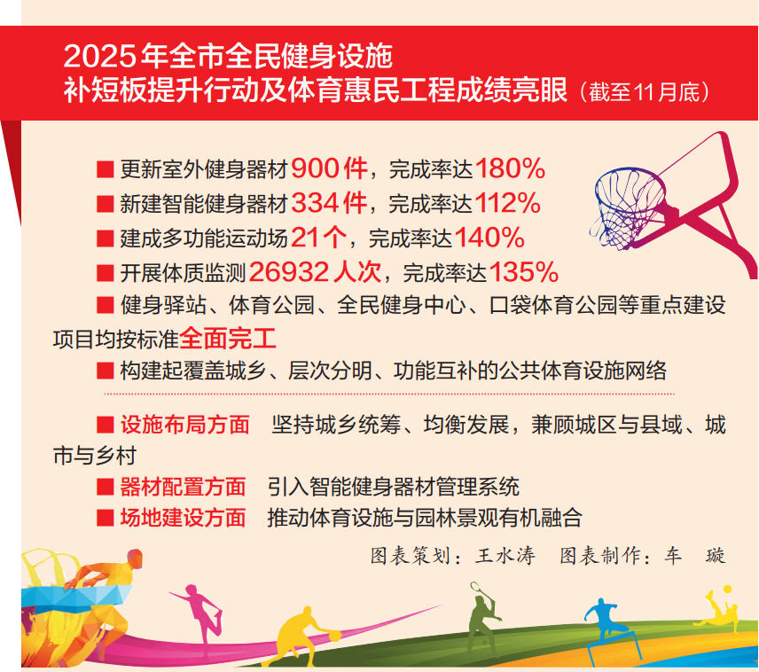 “经过全市体育系统的不懈努力,我们不仅圆满完成了各项既定任务,更实现了多个指标的突破性增长。”市体育局负责人介绍,截至11月底,全市实际更新室外健身器材900件,完成率达180%;新建智能健身器材334件,完成率达112%;建成多功能运动场21个,完成率达140%;开展体质监测26932人次,完成率达135%。同时,健身驿站、体育公园、全民健身中心、口袋体育公园等重点建设项目均按标准全面完工,构建起覆盖城乡、层次分明、功能互补的公共体育设施网络。