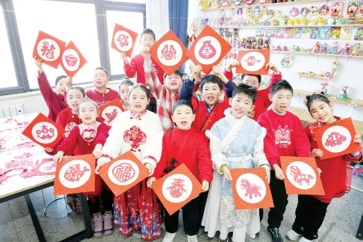 孩子们一起展示自己的剪纸作品。