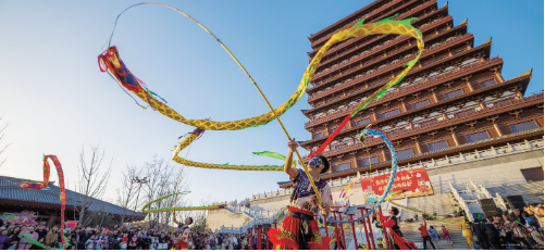 2月19日,山阳区南水北调文旅小镇热闹非凡,非遗节目黄河飞龙精彩上演,吸引众多游客驻足观赏。记者 贾 蓝 摄