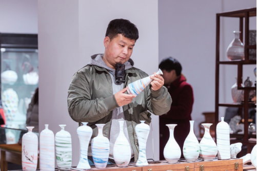 2月19日,游客在山阳区陶三文化艺术园参观绞胎瓷。记者 贾 蓝 摄