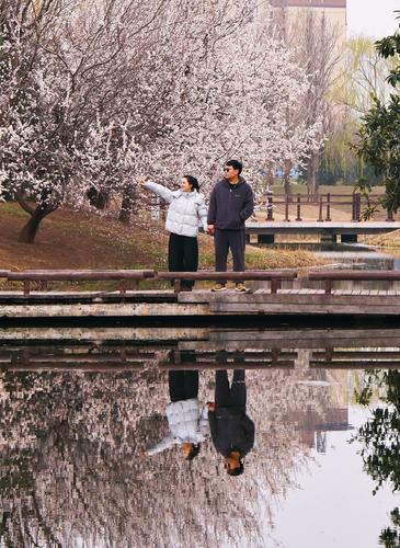 3月8日,市民在武陟县凤仪湖畔赏杏花。古小兵 摄