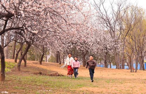 3月8日,武陟县凤仪湖畔杏花绽放,孩子们尽享春日惬意。古小兵 摄
