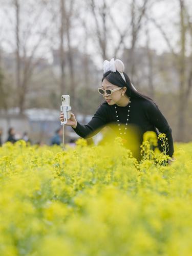 市民在孟州市滨河公园内的油菜花前拍照打卡。记者 贾 蓝 摄