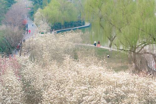 市龙源湖公园西门附近,白玉兰清雅如画;市人民公园悬索桥西南侧,玉兰树姿舒展,花开满枝,环境清幽,是写生、拍照的绝佳去处;市丰收路大转盘一带,北有白玉兰如雪,南有紫玉兰似霞,车行其间,花香扑面,让人不经意间与春光撞个满怀;焦作迎宾馆内,玉兰树长势繁茂,花开如云,雅致宜人,漫步其间步步生香,静享春日慢时光。市天河公园和市月季公园内,玉兰也错落栽植,与垂柳、青草相映,为早春添上一抹清丽亮色。
