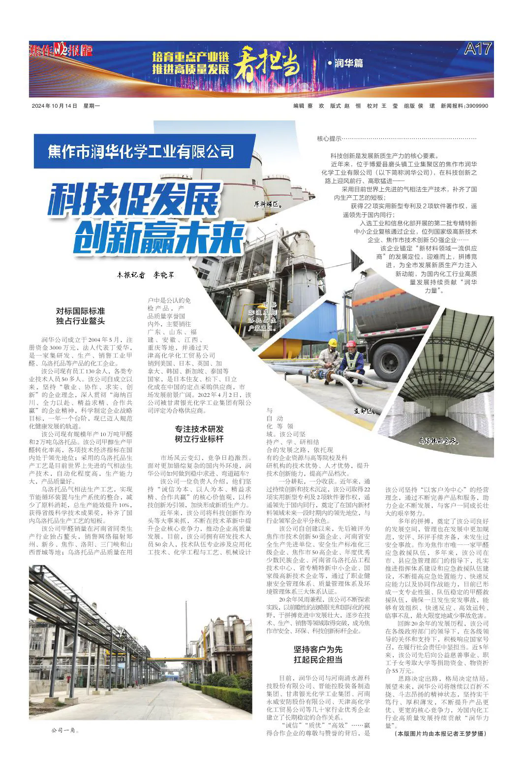 近年来,位于博爱县磨头镇工业集聚区的焦作市润华化学工业有限公司(以下简称润华公司),在科技创新之路上迎风前行、高歌猛进——